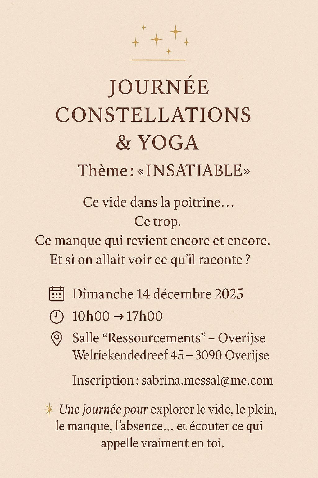 Inscription via email: sabrina.messal@me.com ou en remplissant le formulaire ci-dessous ⬇️