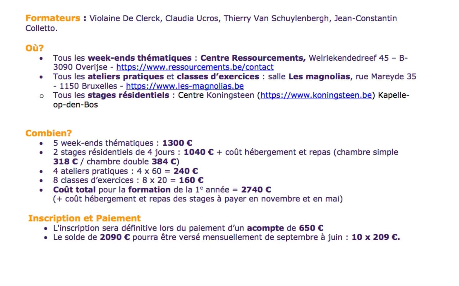Dans le cycle de base : la Voie de l’intégration psychocorporelle (2 ans de formation), seuls les 5 week-end thématiques se donnent à Ressourcements. Pour les autres modules : voir programme ci-contre.
